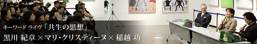 黒川:今日はお越しいただきありがとうございました。今回、国立新美術館で私の展覧会「黒川紀章展─機械の時代から生命の時代へ─」を開催したのは、建築の展覧会でもこれだけ多くの人が来てくれるよ、ということを証明したかったからなんですね。それで私の友人である多方面の作家たちにもそれぞれの作品を持ち寄ってもらい、展示させていただきました。写真家の稲越さんにはセーヌ川の写真作品を出していただき、あるいは画家・千住博さんの絵画作品などを展示させてもらいました。みんな私の仲間であり、友人なのです。今日はその代表として稲越さんやマリ・クリスティーヌさんとお話ができてたいへんよかった。ありがとうございました。